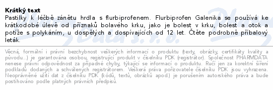 Pastilky k léčbě zánětu hrdla s flurbiprofenem. Flurbiprofen Galenika se používá ke krátkodobé úlevě od příznaků bolavého krku, jako je bolest v krku, bolest a otok a potíže s polykáním, u dospělých a dospívajících od 12 let. Čtěte pozorně příbalový leták.