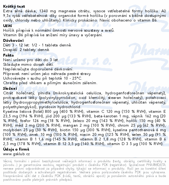 Extra silná dávka, 1340 mg magnesia citrátu, vysoce vstřebatelné formy hořčíku. Až 9, 5x vyšší vstřebatelnost díky organické formě hořčíku (v porovnání s běžně dostupnými oxidy, chloridy nebo uhličitany). Klinicky prokázáno. Navíc obohaceno o vitamin B6.
