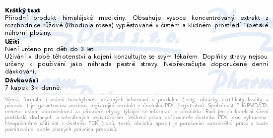 Přírodní produkt himalájské medicíny. Obsahuje vysoce koncentrovaný extrakt z rozchodnice růžové (Rhodiola rosea) vypěstované v čistém a klidném prostředí Tibetské náhorní plošiny.