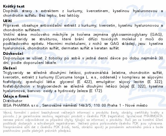 Doplněk stravy s extraktem z kurkumy, kvercetinem, kyselinou hyaluronovou a chondroitin sulfátu. Bez lepku, bez laktózy.