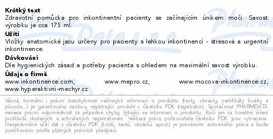 Zdravotní pomůcka pro inkontinentní pacienty se začínajícím únikem moči. Savost výrobku je cca 175 ml.