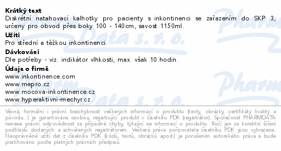 Diskrétní natahovací kalhotky pro pacienty s inkontinenci se zařazením do SKP 3, určeny pro obvod přes boky 100 - 140cm, savost 1150ml.
