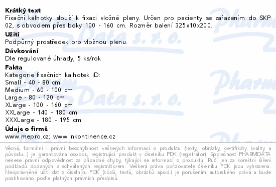 Fixační kalhotky slouží k fixaci vložné pleny. Určen pro pacienty se zařazením do SKP 02, s obvodem přes boky 100 - 160 cm. Rozměr balení 325x10x200.
