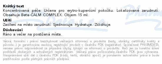 Koncentrovaná péče. Určena pro erytro-kuperózní pokožku. Lokalizované zarudnutí. Obsahuje Beta-CALM COMPLEX. Objem 15 ml.
