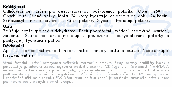 Odličovací gel. Určen pro dehydratovanou, poškozenou pokožku. Objem 250 ml. Obsahuje tři účinné složky: Moist 24, který hydratuje epidermis po dobu 24 hodin. Skinasensyl - snižuje nervovou stimulaci pokožky. Glycerin - hydratuje pokožku.