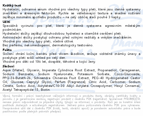 Hydratační, ochranné sérum vhodné pro všechny typy pleti, které jsou denně vystaveny znečištění a stresovým faktorům. Rychle se vstřebávající textura a snadné roztírání zajišťuje minimální spotřebu produktu – na celý obličej stačí pouhé 3 kapky.