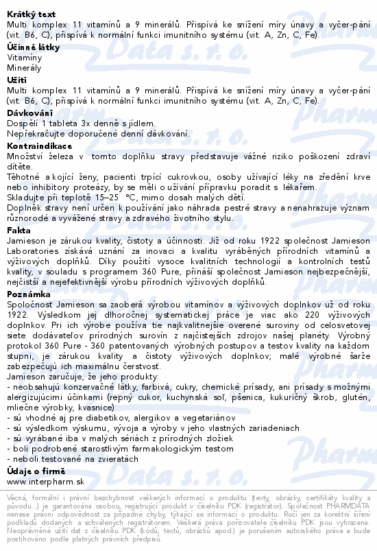 Multi komplex 11 vitamínů a 9 minerálů. Přispívá ke snížení míry únavy a vyčerÂpání (vit. B6, C), přispívá k normální funkci imunitního systému (vit. A, Zn, C, Fe).