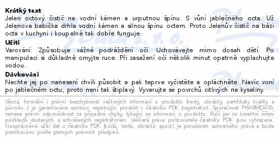 Jelen octový čistič na vodní kámen a urputnou špínu. S vůní jablečného octa. Už Jelenova babička drhla vodní kámen a silnou špínu octem. Proto Jelenův čistič na bázi octa v kuchyni i koupelně tak dobře funguje.