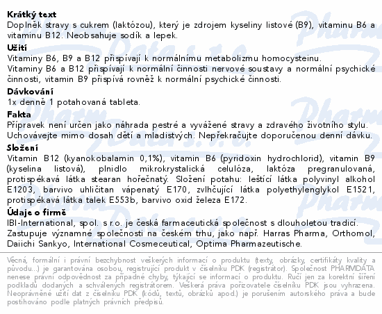 Doplněk stravy s cukrem (laktózou), který je zdrojem kyseliny listové (B9), vitaminu B6 a vitaminu B12. Neobsahuje sodík a lepek.