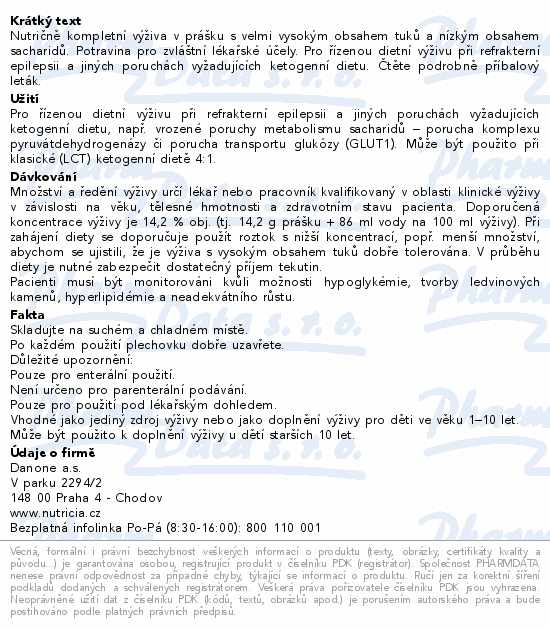 Nutričně kompletní výživa v prášku s velmi vysokým obsahem tuků a nízkým obsahem sacharidů. Potravina pro zvláštní lékařské účely. Pro řízenou dietní výživu při refrakterní epilepsii a jiných poruchách vyžadujících ketogenní dietu. Čtěte pozorně příbalový leták.
