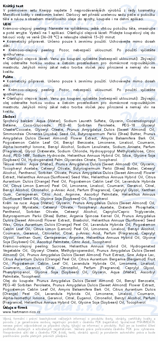 V prémiovém setu Kneipp najdete 5 nejprodávanějších výrobků z řady kosmetiky Mandlové květy v cestovním balení. Dárkový set přináší ucelenou sadu péče o pokožku těla a rukou s obsahem mandlového oleje do sprchy, koupele i na denní aplikaci.