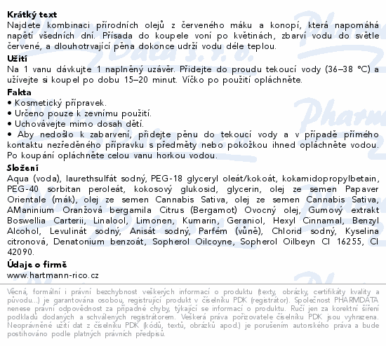 Najdete kombinaci přírodních olejů z červeného máku a konopí, která napomáhá napětí všedních dní. Přísada do koupele voní po květinách, zbarví vodu do světle červené, a dlouhotrvající pěna dokonce udrží vodu déle teplou.