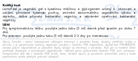 LactoFeel je vaginální gel s kyselinou mléčnou a glykogenem určený k: obnovení a udržení přirozené kyselosti pochvy, zmírnění abnormálního vaginálního výtoku a zápachu, léčbě příznaku bakteriální vaginózy a zabránění opakování bakteriální vaginózy.