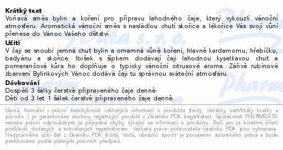 Voňavá směs bylin a koření pro přípravu lahodného čaje, který vykouzlí vánoční atmosféru. Aromatická vánoční směs s nasládlou chutí skořice a lékořice Vás svojí vůní přenese do Vánoc Vašeho dětství.