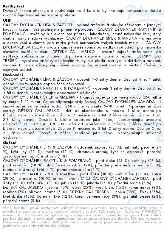 Balení obsahuje 3 druhy čajů: LEROS ČAJOVÝ DÝCHÁNEK ČERNÝ RYBÍZ, LEROS...
