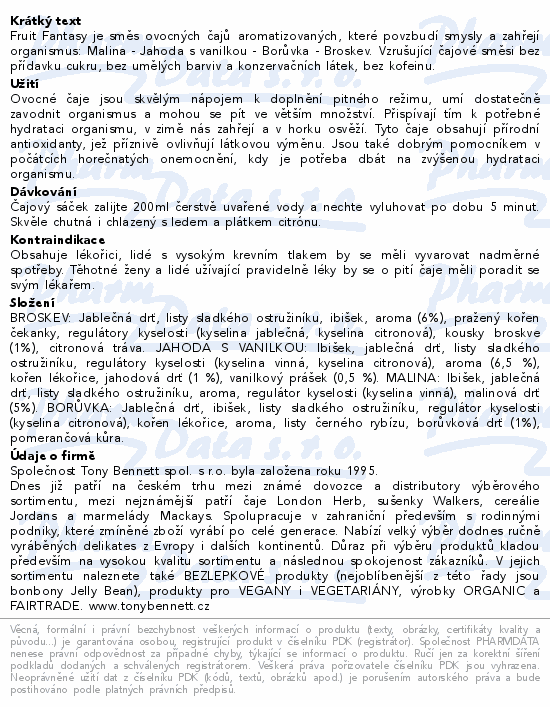 Fruit Fantasy je směs ovocných čajů aromatizovaných, které povzbudí smysly a zahřejí organismus: Malina - Jahoda s vanilkou - Borůvka - Broskev. Vzrušující čajové směsi bez přídavku cukru, bez umělých barviv a konzervačních látek, bez kofeinu.