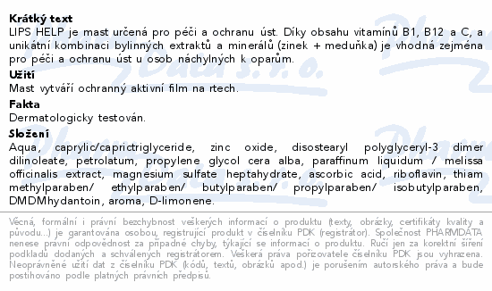 LIPS HELP je mast určená pro péči a ochranu úst. Díky obsahu vitamínů B1, B12 a C, a unikátní kombinaci bylinných extraktů a minerálů (zinek + meduňka) je vhodná zejména pro péči a ochranu úst u osob náchylných k oparům.