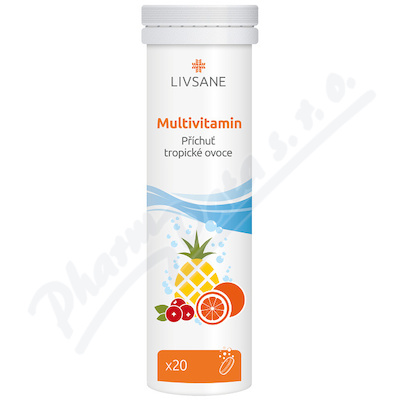LIVSANE šumivý multivitamín s příchutí tropického ovoce, balení 20 šumivých tablet. Navrženo, aby dodal všechny potřebné vitamíny pro zdravý životní styl. Přispívá k odstranění únavy, podporuje metabolismus a nervový systém.
