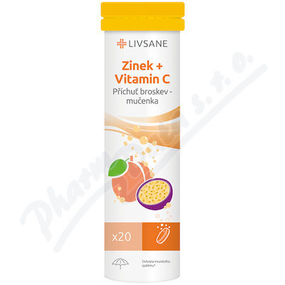 LIVSANE Zinek + vitamin C šumivé tablety s příchutí broskev a maracuja, balení 20 rozpustných tablet. Podporuje funkci imunitního systému, kostí, zubů, přispívá k odstranění únavy.