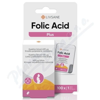 LIVSANE FOLIC ACID PLUS s 400 mcg kyseliny listové a vitaminy skupiny B ve vysokých dávkách ve formě snadno polykatelných minitablet. Bez lepku, laktózy, fruktózy, sladidel, živočišných složek, barviv a aromat.