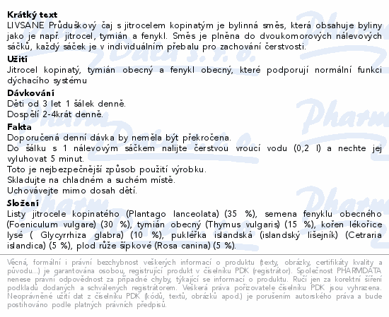 LIVSANE Průduškový čaj s jitrocelem kopinatým je bylinná směs, která obsahuje byliny jako je např. jitrocel, tymián a fenykl. Směs je plněna do dvoukomorových nálevových sáčků, každý sáček je v individuálním přebalu pro zachování čerstvosti.