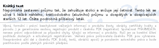 Napomáhá zastavení průjmu tak, že zahušťuje stolici a snižuje její četnost. Tento lék se užívá k léčbě náhlého, krátkodobého (akutního) průjmu u dospělých a dospívajících starších 12 let. Čtěte pozorně příbalový leták.
