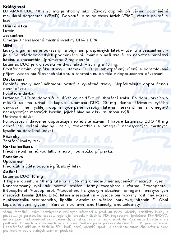 LUTAMAX DUO 10 a 20 mg je vhodný jako výživový doplněk při věkem podmíněné makulární degeneraci (VPMD). Doporučuje se ve všech fázích VPMD, včetně pokročilé fáze.