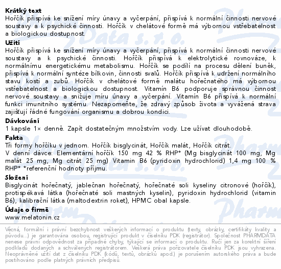 Hořčík přispívá ke snížení míry únavy a vyčerpání, přispívá k normální činnosti nervové soustavy a k psychické činnosti. Hořčík v chelátové formě má výbornou vstřebatelnost a biologickou dostupnost.