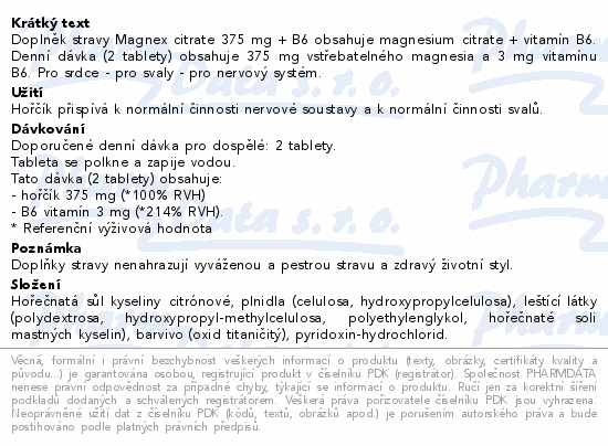 Doplněk stravy Magnex citrate 375 mg + B6 obsahuje magnesium citrate + vitamín B6. Denní dávka (2 tablety) obsahuje 375 mg vstřebatelného magnesia a 3 mg vitamínu B6. Pro srdce - pro svaly - pro nervový systém.
