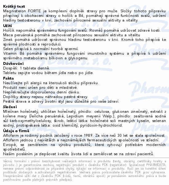 Magnisteron FORTE je komplexní doplněk stravy pro muže. Složky tohoto přípravku přispívají k obohacení stravy o hořčík a B6, pomáhají správné funkčnosti svalů, udržení hladiny testosteronu v krvi, zachování přirozené sexuální aktivity a vitality.