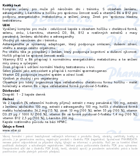 Komplex určený pro muže při náročném dni i tréninku. S obsahem ženšenu, ashwagandhy, L-karnitinu a hořčíku pro správnou činnost svalů a vitaminů B6 a B12 pro podporu energetického metabolizmu a snížení únavy. Zinek pro správnou hladinu testosteronu.
