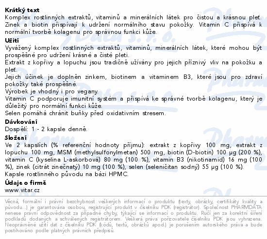 Komplex rostlinných extraktů, vitaminů a minerálních látek pro čistou a krásnou pleť. Zinek a biotin přispívají k udržení normálního stavu pokožky. Vitamin C přispívá k normální tvorbě kolagenu pro správnou funkci kůže.
