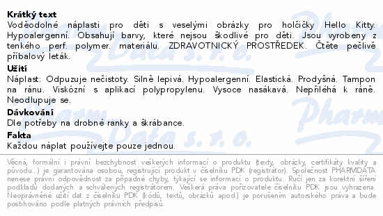 Voděodolné náplasti pro děti s veselými obrázky pro holčičky Hello Kitty. Hypoalergenní. Obsahují barvy, které nejsou škodlivé pro děti. Jsou vyrobeny z tenkého perf. polymer. materiálu. ZDRAVOTNICKÝ PROSTŘEDEK. Čtěte pečlivě příbalový leták.