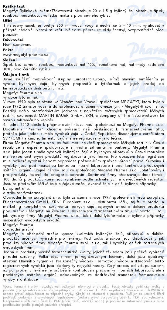 Megafyt Bylinková lékárnaTěhotenství obsahuje 20 x 1, 5 g bylinný čaj obsahuje šípek, rooibos, meduňkovu, voňatku, mátu a plod černého rybízu.