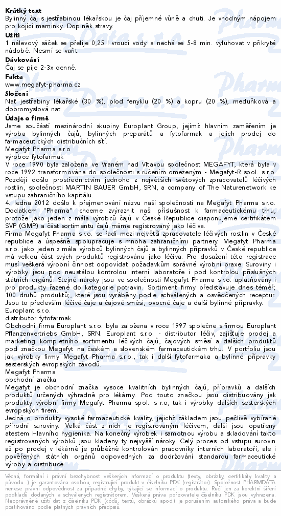 Bylinný čaj s jestřabinou lékařskou je čaj příjemné vůně a chuti. Je vhodným nápojem pro kojící maminky. Doplněk stravy.