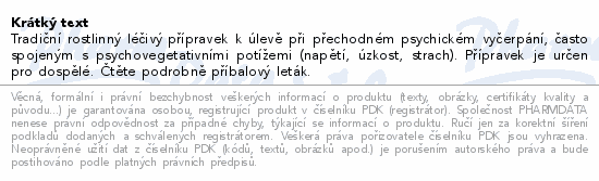 Tradiční rostlinný léčivý přípravek k úlevě při přechodném psychickém vyčerpání, často spojeným s psychovegetativními potížemi (napětí, úzkost, strach). Přípravek je určen pro dospělé. Čtěte pozorně příbalový leták.