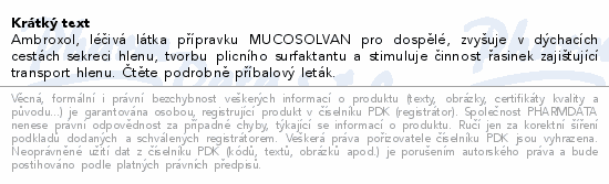 Ambroxol, léčivá látka přípravku MUCOSOLVAN pro dospělé, zvyšuje v dýchacích cestách sekreci hlenu, tvorbu plicního surfaktantu a stimuluje činnost řasinek zajišťující transport hlenu. Čtěte pozorně příbalový leták.