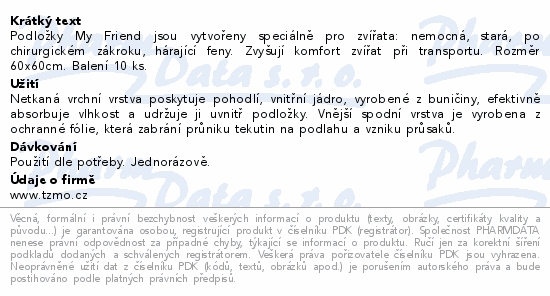 Podložky My Friend jsou vytvořeny speciálně pro zvířata: nemocná, stará, po chirurgickém zákroku, hárající feny. Zvyšují komfort zvířat při transportu. Rozměr 60x60cm. Balení 10 ks.