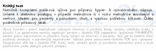 Nutričně kompletní prášková výživa pro přípravu hyper- či izokalorického nápoje. Určena k dietnímu postupu v případě malnutrice či v riziku malnutrice související s nemocí. Ideální pro pacienty s poruchami chuti, s vysokou potřebou bílkovin. Čtěte pozorně příbalový leták.