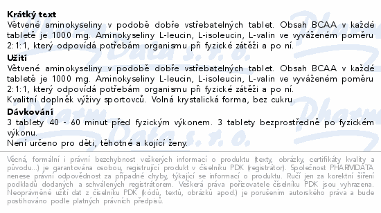 Větvené aminokyseliny v podobě dobře vstřebatelných tablet. Obsah BCAA v každé tabletě je 1000 mg. Aminokyseliny L-leucin, L-isoleucin, L-valin ve vyváženém poměru 2:1:1, který odpovídá potřebám organismu při fyzické zátěži a po ní.