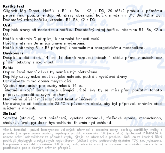 Oligovit Mg Direct, Hořčík + B1 + B6 + K2 + D3, 20 sáčků prášku k přímému perorálnímu použití je doplněk stravy obsahující hořčík a vitamin B1, B6, K2 a D3. Dodatečný zdroj hořčíku, vitaminu B1, B6, K2 a D3.