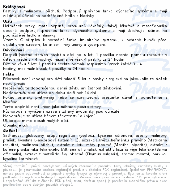 Pastilky s malinovou příchutí. Podporují správnou funkci dýchacího systému a mají zklidňující účinek na podrážděné hrdlo a hlasivky.