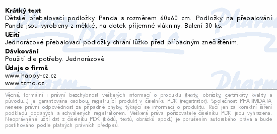 Dětské přebalovací podložky Panda s rozměrem 60x60 cm. Podložky na přebalování Panda jsou vyrobeny z měkké, na dotek příjemné vlákniny. Balení 30 ks.