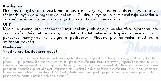 Pharmedis mýdlo s nanostříbrem a kaolinem díky výjimečnému složení pomáhá při zánětech, vyživuje a regeneruje pokožku. Zklidňuje, vyhlazuje a mineralizuje pokožku a zároveň zlepšuje přirozenou obranyschopnost. Pokožku nevysušuje.