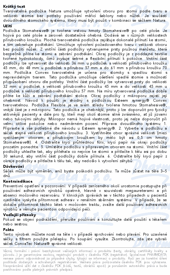 Tvarovatelná podložka Natura umožňuje vytvoření otvoru pro stomii podle tvaru a velikosti stomie bez potřeby používání měřicí šablony nebo nůžek. Je součástí dvoudílného stomického systému, který musí být použit v kombinaci se sáčkem Natura.