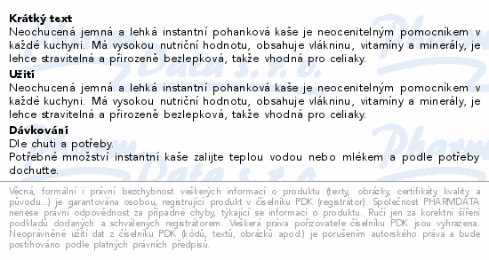 Neochucená jemná a lehká instantní pohanková kaše je neocenitelným pomocníkem v každé kuchyni. Má vysokou nutriční hodnotu, obsahuje vlákninu, vitamíny a minerály, je lehce stravitelná a přirozeně bezlepková, takže vhodná pro celiaky.