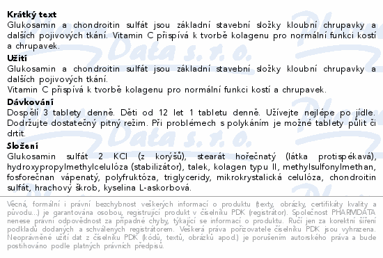 Glukosamin a chondroitin sulfát jsou základní stavební složky kloubní chrupavky a dalších pojivových tkání. Vitamin C přispívá k tvorbě kolagenu pro normální funkci kostí a chrupavek.