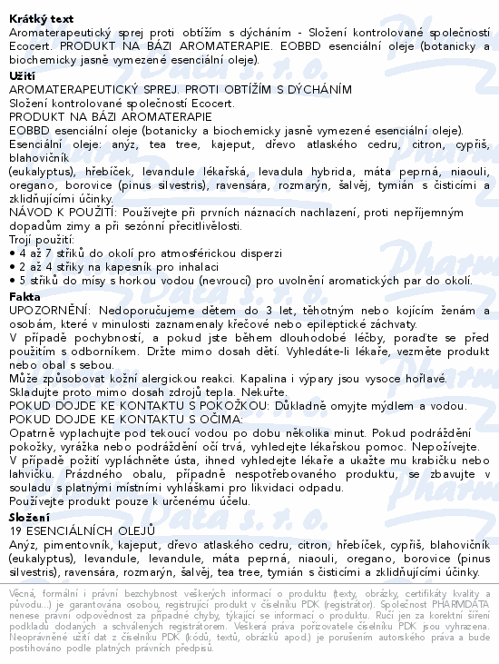 Aromaterapeutický sprej proti obtížím s dýcháním - Složení kontrolované společností Ecocert. PRODUKT NA BÁZI AROMATERAPIE. EOBBD esenciální oleje (botanicky a biochemicky jasně vymezené esenciální oleje).