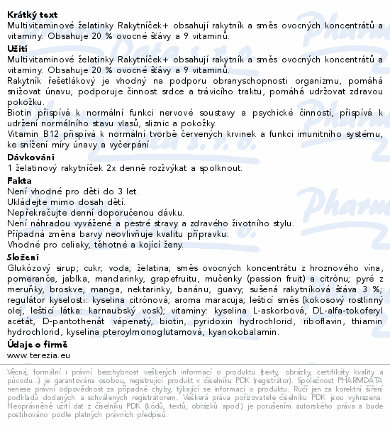 Multivitaminové želatinky Rakytníček+ obsahují rakytník a směs ovocných koncentrátů a vitaminy. Obsahuje 20 % ovocné šťávy a 9 vitaminů.