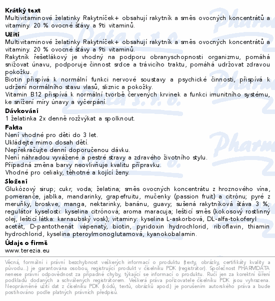 Multivitaminové želatinky Rakytníček+ obsahují rakytník a směs ovocných koncentrátů a vitaminy. 20 % ovocné šťávy a 9ti vitaminů.
